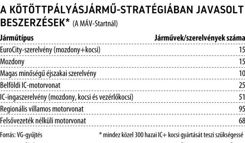 Szükség lesz 25 belföldi IC-motorvonat beszerzésére, amelyek 160 kilométer per órás sebességre alkalmasak, továbbá 51 IC-ingaszerelvényre (ez mozdonyt, kocsit és vezérlőkocsit tartalmaz). Ezenfelül 95 regionális villamos motorvonat beszerzését is javasoljuk, ebből 80-ra már kiírtunk előzetes piaci konzultációs felhívást. Szerepel a stratégiában 68 felsővezeték nélküli motorvonat, ami lehet új technológia is, tehát hibrid (villany plusz akkus), de hidrogénüzemű is. A felsoroltak további, közel 300 IC+-kocsi hazai gyártását teszik szükségessé.
